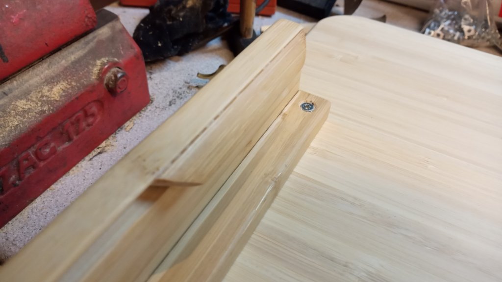 dem Tisch befindlichen Blenden, die Bestandteil des Ablagefachs sind, werden mit Senkschrauben M5 in den Aluprofilen fest verschraubt. Das Bambus ist