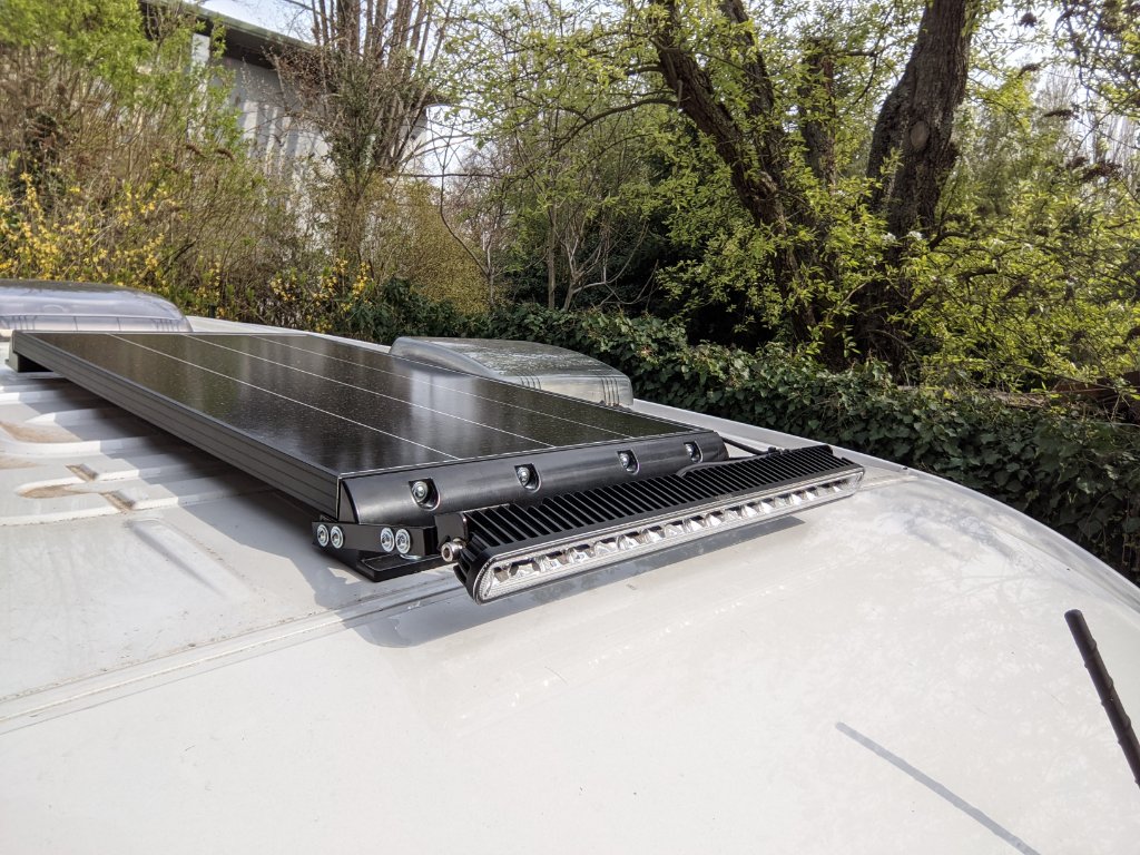 Solaranlage auf dem Dach, Scheinwerfer angebracht.