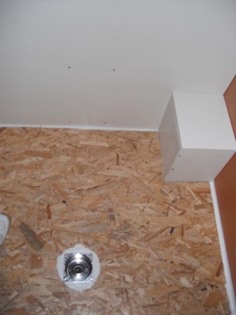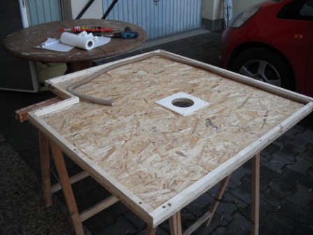 Momentan sind wir an der Nasszelle beschäftigt. Der Boden wird gefliest. Davor haben wir ein Loch durch das Fahrzeugbelch gebort für den Abfluss. Danach eine Holzpallte auf dir richtigen maße zugeschnitten und befestigt. Wir haben einen Rahmen an der Unterseite des Holzbodens befestigt um nachher ein Gefälle zu schaffen. Um das Gefälle zu fertigen haben wir neben dem Abfluss zwei schrauben durch das Fahrzeug hindurchegeschraubt das es die Holzpallte nach unten zieht.
