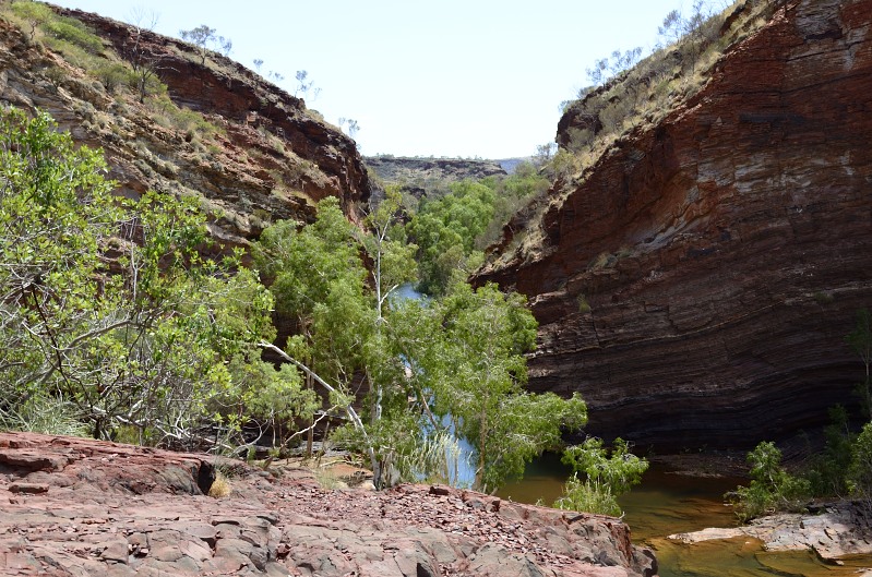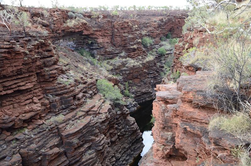 Weiter gehts…zur nächsten Gorge. Ich kann die eigentlich alle zusammenfassen, da sie alle zusammengehören und in der Wittenoom Gorge zusammenflessen. Es sind die Hancook Gorge, die Joffre Gorge und die Knox Gorge. Die Gorges sind so zwischen 50 und 100 m tief in die BIF’s der Hammersley Range eingeschnitten.