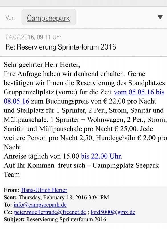 Mail an Platz is raus mit der Bitte um abechließende Bestätigung der Reservierung und der abgesprochenen Konditionen !