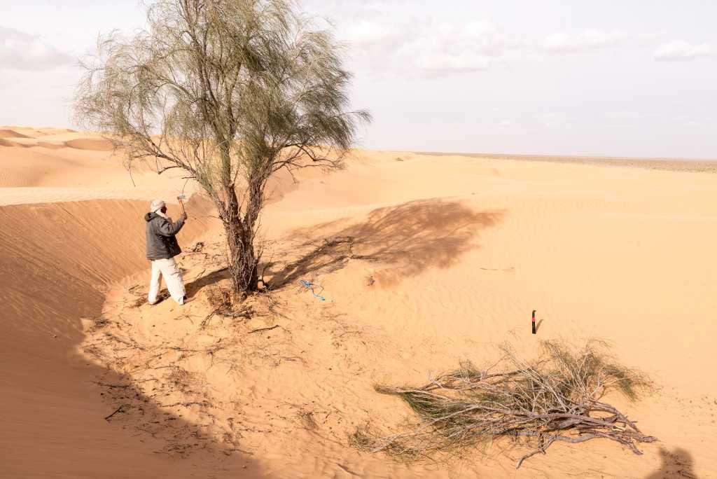 Ein kleines Problem ist aber das Holz dafür – davon gibt es in den Dünen und auch außerhalb nicht viel davon. Und so mussten wir zum Teil ziemlich weit gehen, bis wir einen Baum fanden. Abdallah, unser Guide, versuchte auch immer nicht allzu viel Holz von einem Baum zu nehmen. Hauptsächlich wurden Äste genommen, die entweder schon am Boden lagen oder die schon abgestorben noch am Baum waren.
