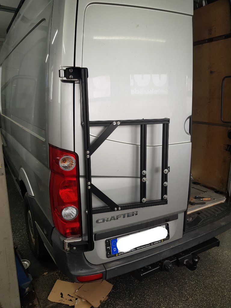 Kannst du das bitte Mal im Detail vorstellen? Wie bist du an die Scharniere dran gegangen? Welche Schrauben? Die Scharniere sind ja schräg, hat du da passende Keile gebaut? Und wie bist du raus gegangen, damitv der Träger auch parallel zum Heck ist, die Tür ist ja nach außen gewölbt.