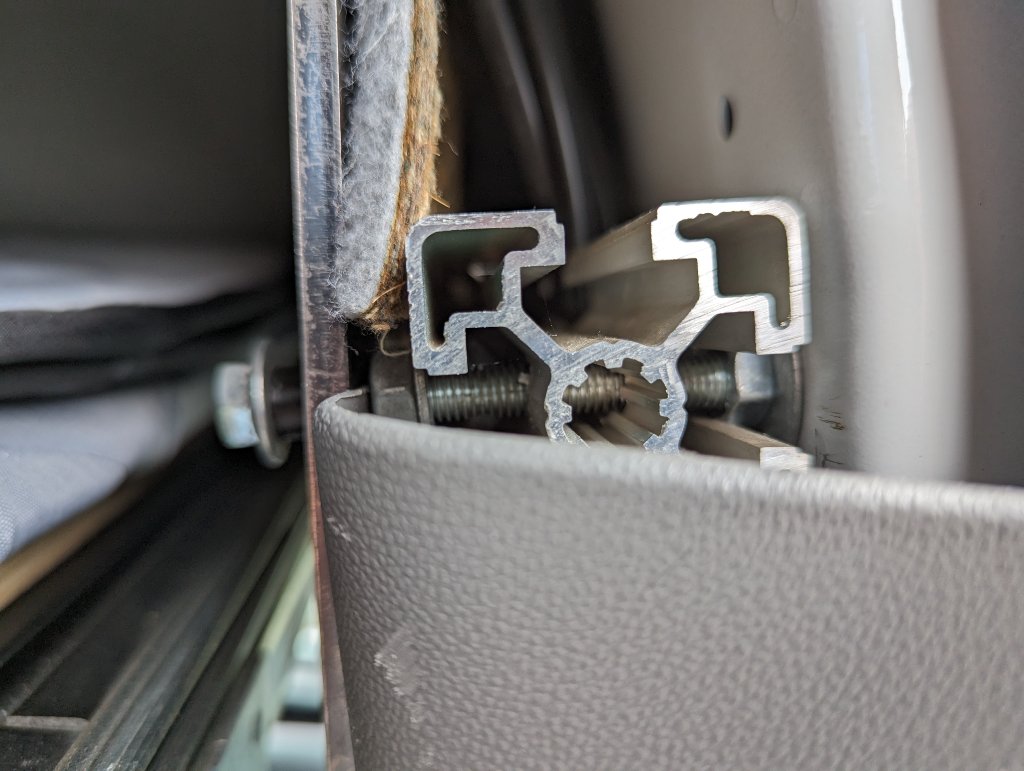 Vorne wie hinten ist zwischen Winkel und Karosserie ein Profilstück. Beides läuft frei und ich fixiere das Bett über eine Abhängung von der Decke wenn es ausgezogen ist