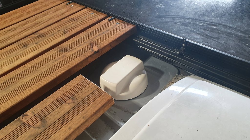 In dem entstandenen Stauraum vor diesem "Schubladengestell" sind unter einer Serviceklappe der Frischwassertank und Pumpe mitsamt der Wasserleitungen und Absperrventile verbaut, sowie die Standheizung. Eine "Belüftungsöffnung" an Seite muss ich noch mit einem entsprechenden Lüftungsgitter versehen. Die Serviceklappe ist recht stabil und mit einer rutschhemmenden Matte beklebt, so dass es als Ablage für größere Taschen, Gitterboxen o.ä. dient, an die man nicht so oft herankommen muss.
