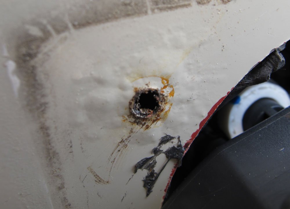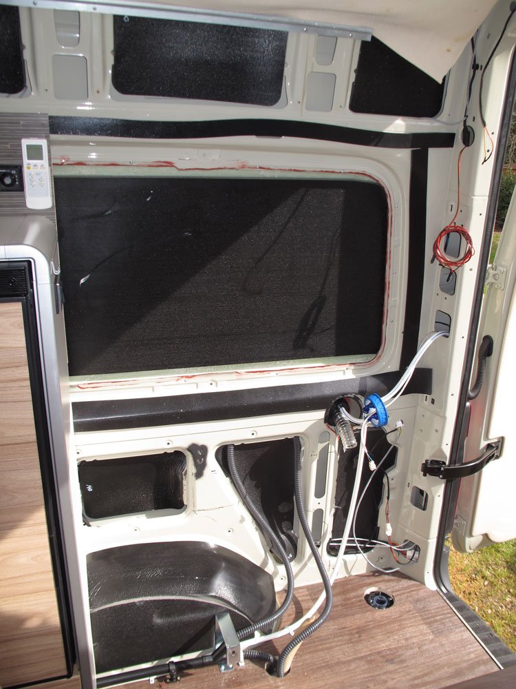 Im unterstehendes Bild einen Durchschau entlang den Schlauch vom den Grauwasserbehalter durch den unterseite Fahrzeug zum Trinkwasserraum. Auch nicht richtiug abgedichtet.