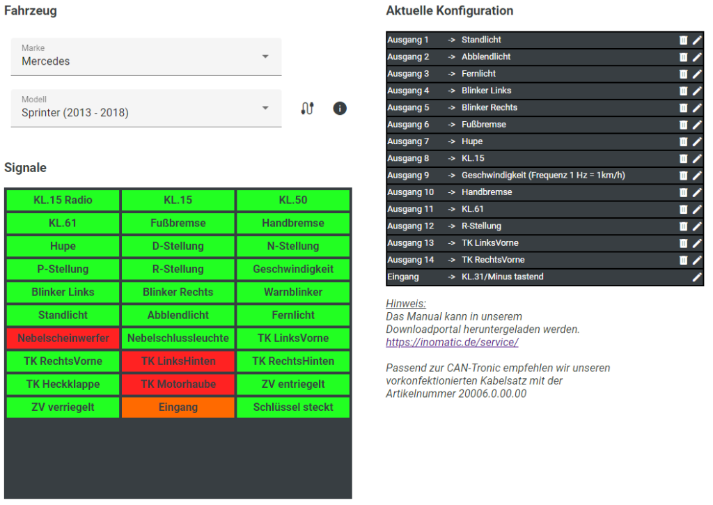 UVP 189,- €, direkt über inomatic zu beziehen. Die im Anhang (Sprinter 2013-2018) grün markierten Signale lassen sich frei/beliebig auf die 14 Ausgänge konfigurieren.