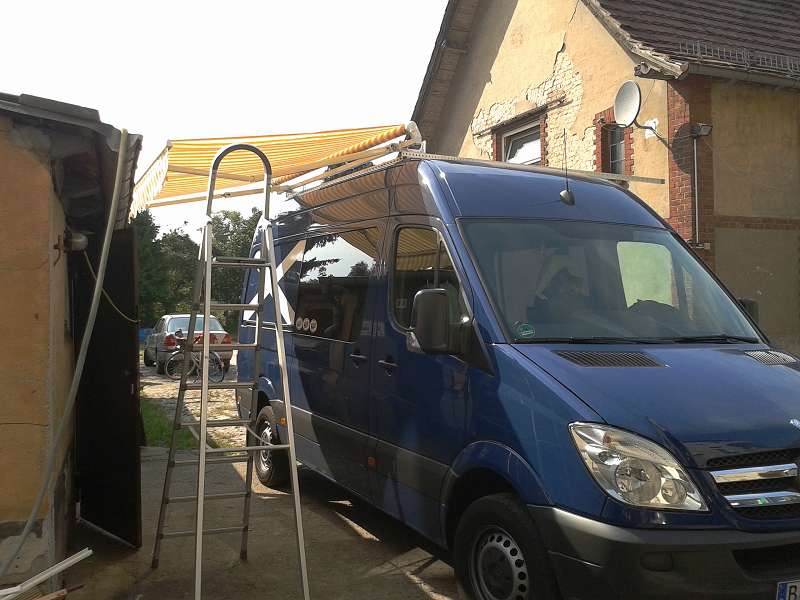 Nachdem ich jetzt eine 4m Markise habe ( Sprinter langer Radstand ca.4,35m ) kann ich die Markise neigen wie ich will, beim ein bzw. ausfahren muß ich die Schiebetüre weiterhin schliessen sonst gibt es eine Kollision zwischen Markisenarm und Schiebetür. Ich habe für die Markisenbefestigung eine Selbstgebaute Dachreling benutzt dazu hab ich noch die Markisenbefestigungen geschweißt.