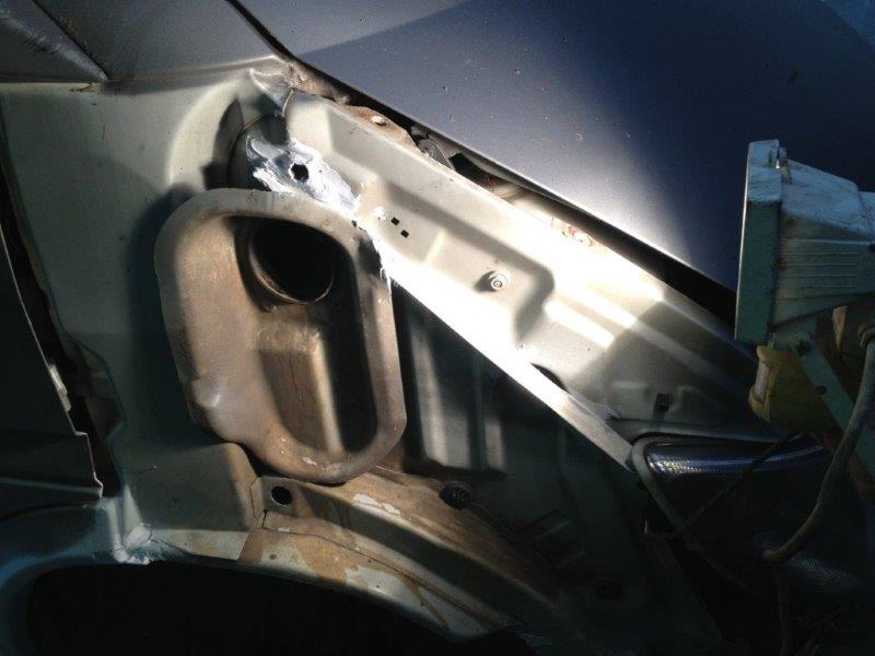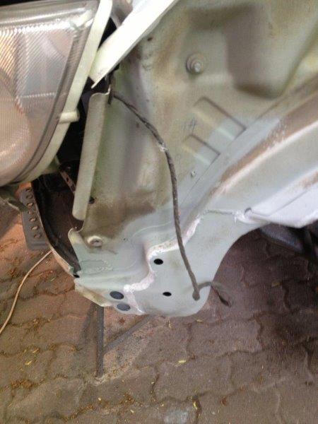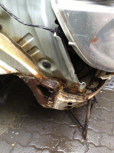 Frontbereich links weggerostet / Die Löcher in dem weggerosteten Teil sind für die Kotflügelhalter