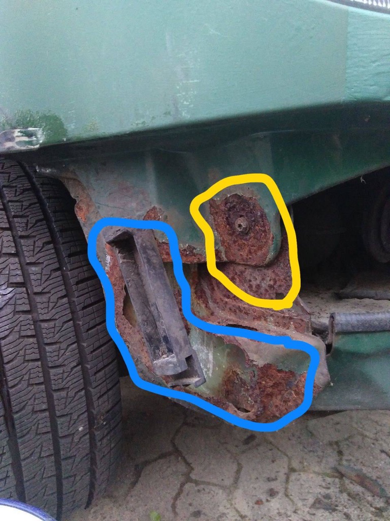 Frontbereich rechts weggerostet / Die Löcher in dem weggerosteten Teil sind für die Kotflügelhalter