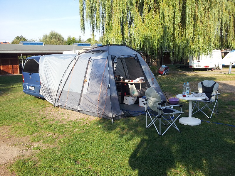 Vor einer Weile hab ich wegen einem Vorzelt gesucht und bin bei einer Variante hängengeblieben bei der ein Kuppelzelt mit 2 Eingängen verwendet wird. Ähnlich der Anbindung Moskitonetz für Schiebetür (CS war das glaube ich) wollte ich bei einem Sattler/Planenschneider nach einer Lösung in Form einer Schleuse fragen, so dass bei Regen der Durchstieg trocken bleibt... Auf dem Dach wird ein größeres Tarp befestigt und übers Zelt gespannt. So bleibt die offene Schiebetür von oben und rechts+links trocken. Das Tarp brauche ich so oder so für sonnige Momente