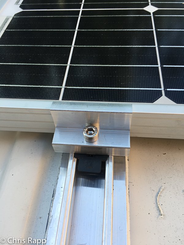 Mit den üblichen GFK Solarspoilern war mit zwei 100W Panels der Platz auf meinem Crafter ausgereizt. In einem anderen Forum bin ich auf die K2 Systems Montageschiene SpeedRail 22/105 0,88 gestoßen. Diese Schienen lassen sich hervorragend auf das Dach in Längsrichtung kleben. Damit kann ich drei Module montieren. Die 100 W Solarpanels lassen sich dann mit den passenden K2 Systems XS Moduklemmen sehr einfach montieren. Das Schöne, es können Module mit verschiedenen Größen durch die Art der Montage montiert werden. Um ein verschieben der Panels zu verhindern habe ich kurze Aluwinkel an ihre Unterseite geschraubt, diese passen genau in die Schienen. Die Leitungen bekomme ich in den Schienen unter, damit ist kein Kabelkanal nötig. Die Schrauben sichere ich noch mit Liqui Moly.