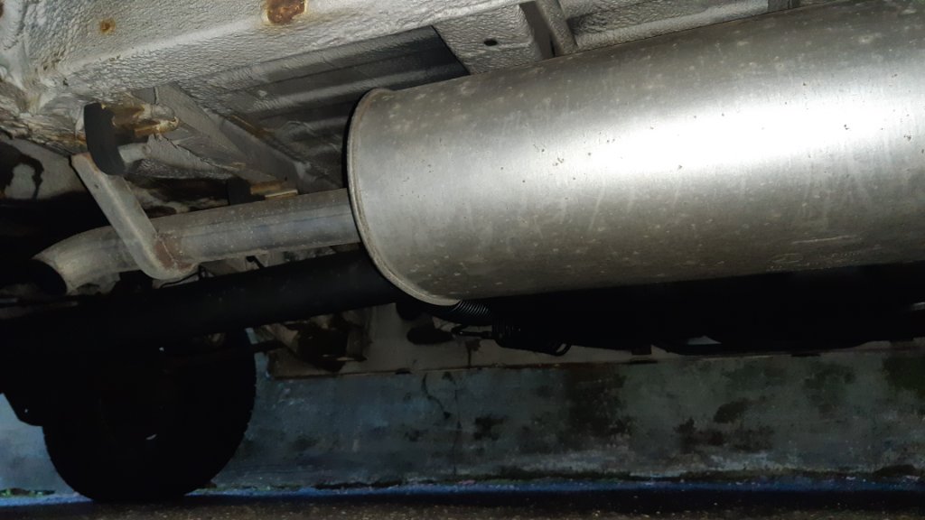 Ich hab jetzt mal drunter geschaut, hinten ist der große Topf, danach Richtung vorne ein kleiner, und dann geht das Rohr auch schon vorne in den Motorblock.