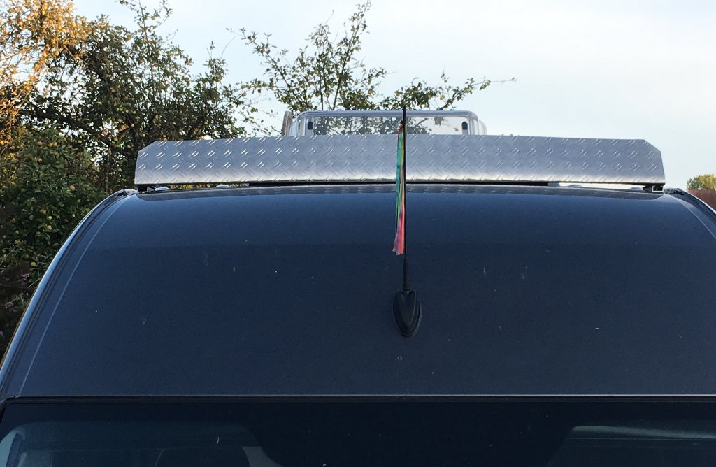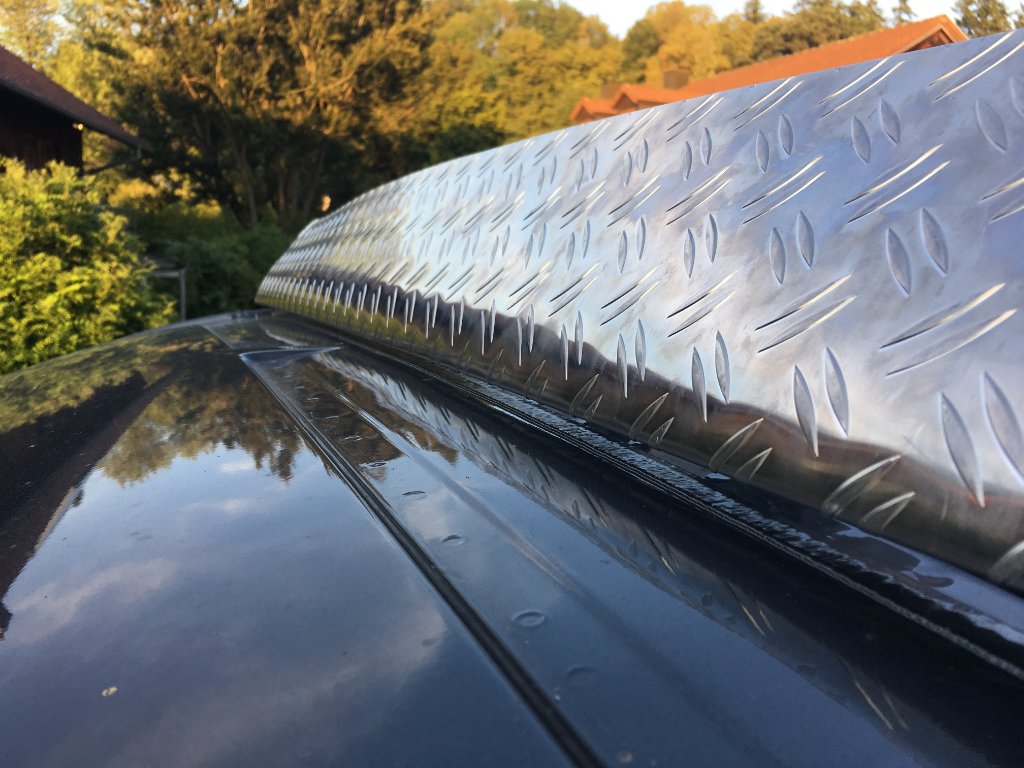 Hätte es nicht geklappt, wärs stattdessen ein Windabweiser aus Kunststoff geworden. Aber es hat die richtige Rundung bekommen (wegen Distanz zum Dach) und hält bisher einwandfrei. Zwischenzeitlich habe ich aus dem ausgeschnittenen Blech noch links und rechts einen schmaler Streifen befestigt.