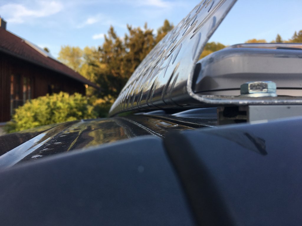 Das Teil in passender Länge, den kurzen Steg entfernen und dann über Kopf mit 4 Nietmuttern und MS Polymer aufs Dach.