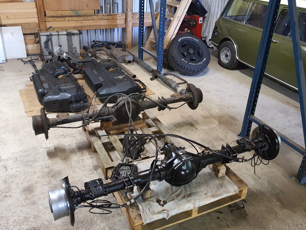 Schritt 1, (vermutlich in der Woche vor Ostern): Ausbau der Hinterachse, der Blattfedern und des Tanks sowie Kardan und Auspuff. Danach Beseitigung aller Korrosionsschäden, insbesondere an der Blattfederaufnahme aber auch des Rahmens. Anschließend der Einbau neuer verstärkter Blattfedern sowie der „4x4- HA“, passend zur VA-Übersetzung. Auch der 4x4-Tank, mit der Einbuchtung für das Verteilergetriebe, wird verbaut. Mit Wiedereinbau der Kardanwelle und des Auspuffs kann das Womo wieder in (den 2x4) Betrieb gehen (vielleicht bleiben noch Tage vom Osterurlaub zum Testen übrig).