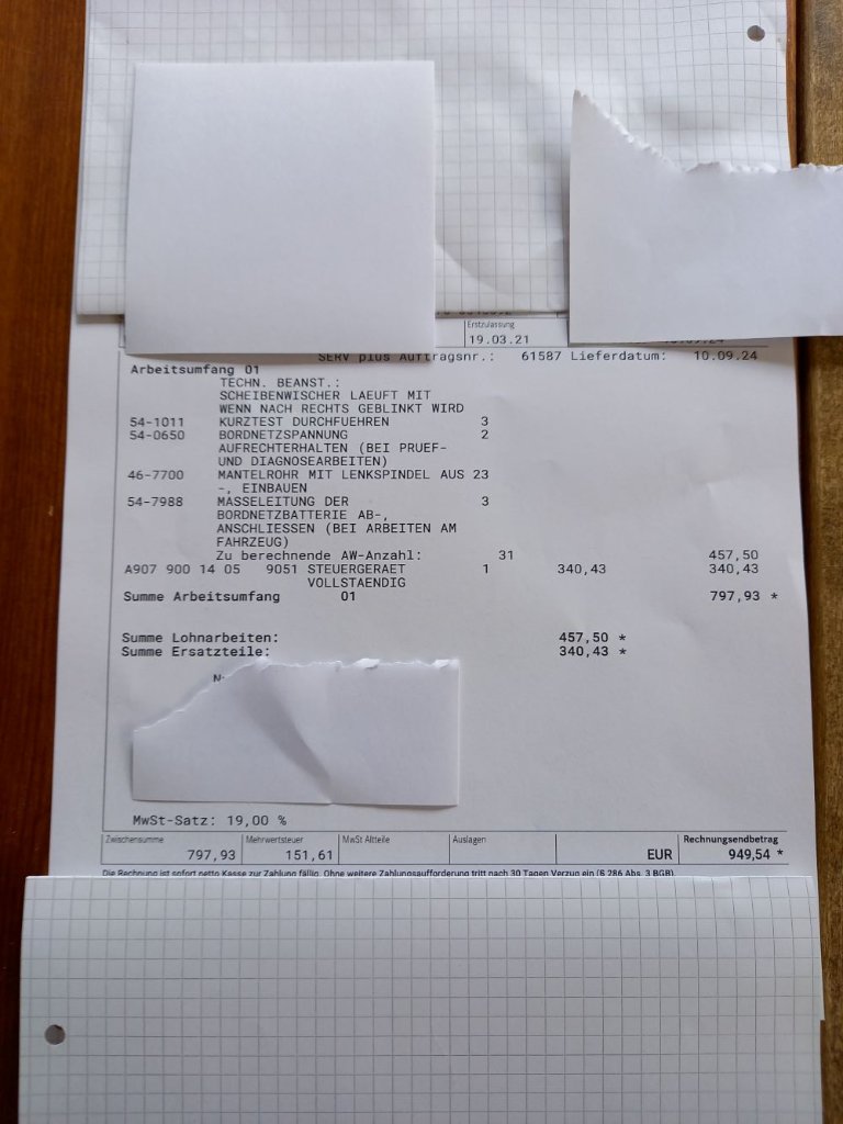 Kostenvoranschlag für o.g. Problem. EZ. 03/21, 47tkm. Keine Kulanz. Bei Sprinter 907/910 Problem bei MB bekannt, lt. Servicemeister.