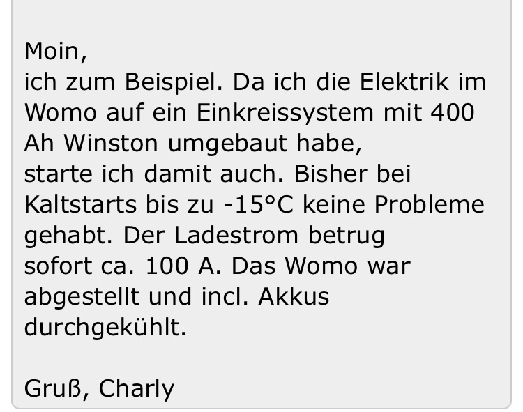 Edit: Dass Mancher da bei Tiefsttemperatur 100A reinpumpt, ohne dass Sie sofort die Grätsche machen, bedeutet nicht, dass das den Zellen gut bekommt. Ich würde das nicht machen...