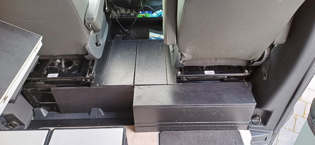 - Zwischen den Vordersitzen. Aus 15mm Multiplex damit man auch drauftreten kann, mit einer "Verlängerung" nach vorne unter die Mittelkonsole unter dem Navi. Das Ganze ist nur an zwei vorhandenen Löchern in der Beifahrer-Sitzkonsole und durch Klemmwirkung befestigt und läßt sich rückstandslos wieder entfernen. Hinter dem Beifahrersitz ist noch ein kleines Klappfach, damit es auch bei umgedrehten Sitz noch zu öffnen ist.