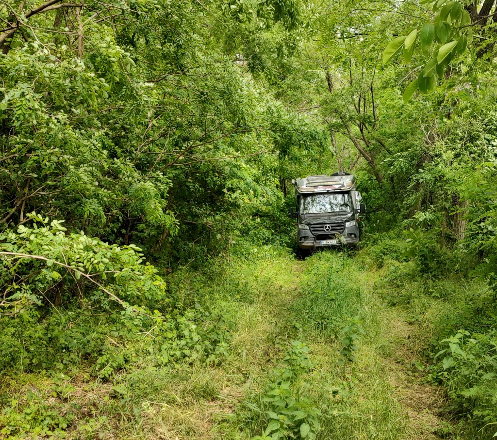 Ja, war lustig da. Ging den halben Tag so. Irgendwann war der Boden so tief das nix mehr ging. Mussten den Ml-t dann mit Muskelkraft auf der Stelle drehen. Zum Teil musste der Weg freigeschnitten werden. Besonders viel Spaß hatte der nigelnagelneue Sprinter mit langem Radstand mit den langen Dornen der Akazienwäldern. Braucht wohl viel neuen Lack.