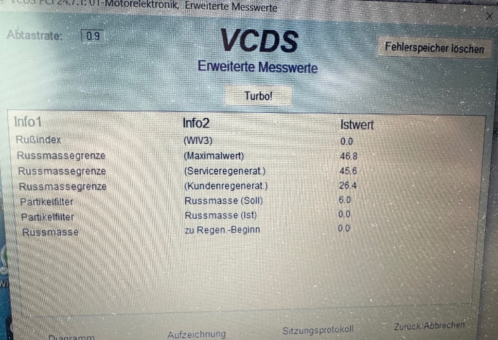• DPF (Partikelfilter) geprüft → Rußmasse 0,0 g → frei und ohne Rückstau.
