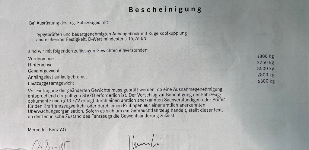 Die Bosal.asap hat geschrieben: 17 Mai 2025 18:25Welche AHK hast du nun eingebaut, bei der auch noch die originale Mercedes Trittstufe passt.Butjadinger hat geschrieben: 17 Mai 2025 17:25 Meine Verbaute von Bosal hat einen D Wert von 20,80. Habe mir dann ohne mir Gedanke über den D Wert zu machen eine gebrauchte originale Mercedes Kupplung mit Tritt gekauft und verbaut. Diese hat nur einen D Wert von 14,1. Der TÜV Prüfer hat mich dann aufgeklärt. Also, die Kupplungen wieder getauscht.