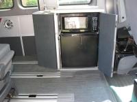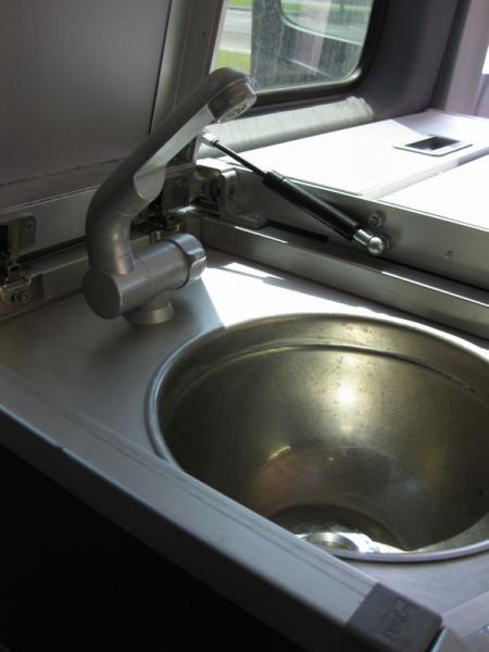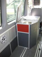 Microwelle, Kompressorkühlschrank, Waschbecken und Wasservorrat so platzsparend wie möglich untergebracht.