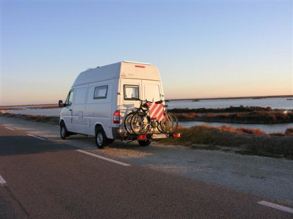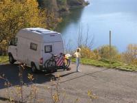 Das letzte Bild zeigt den, ebenfalls nach unseren Plänen von H.R.Z. hergestellten Fahrradträger. Es handelt sich um einen Cary Bike Lift 77, der abgesenkt werden kann. Dieser ist auf einem wegschwenkbaren Rahmen montiert so dass an die Sandbleche wie auch an den Heckstauraum herangekommen werden kann. Im Weiteren ist ein zusätzliches Ersatzrad angebracht worden. Die ganze Konstruktion wird an den Scharnieren angeschraubt und zusätzlich noch auf der Anhängerkupplung abgestützt. Das Ding ist absolute Spitze und hat sich keinen Milimeter auf diversen Rüttelpisten verzogen.