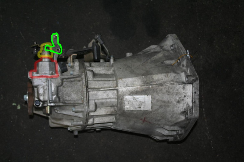 Also, ich denke ich bin jetzt ein Stück schlauer. Gerade noch mal nach dem Hebel (auf dem Bild grün umrandet) gesehen, der ist's auch nicht. Es ist definitiv im Inneren. Meine Vermutung: Dieser Sprinter ist ja beim Bau in Argentinien zugewachst worden wie ein Golf 2 (Schorsch hat es mal gesehen und nicht schlecht gestaunt), Getriebe und unterer Motor sind durch austretendes und sich von der Motorhitze erweichendes Wachs ständig damit überzogen, natürlich vermischt mit dem Straßendreck. Diese Pampe ist wahrscheinlich beim ständigen Hin und Her der Hülse (gelb auf dem Foto) auf dem Zylinder (oberes Ende des rot umrandeten Teils auf dem Foto) beim Schalten nach und nach nach innen geraten und blockiert dort jetzt das Schieben und Federn.