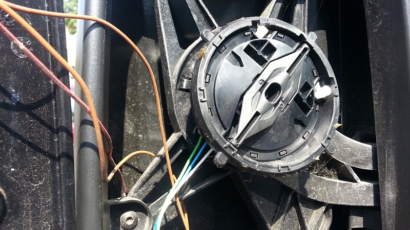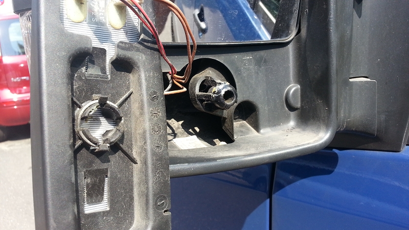 - unterer Weitwinkelspiegel nach links biegen und rechts hinter fassen und nach vorn rausziehen, Vorsichtig. Dahinter ist ein Plastik Kugelgelenk ( siehe Foto ).