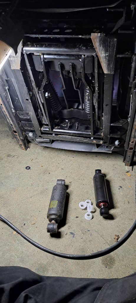 Die Stoßdämpfer sind in die Schwingsitze gekommen. Ich muss irgendwann noch die Sitzlehne vom Beifahrersitz auf Fahrersitz umbauen, also die Lehnenverstellung auf die andere Seite bringen.