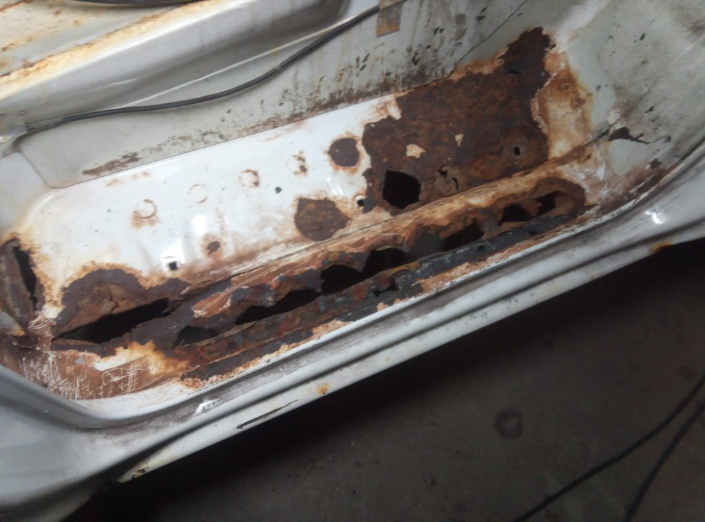 Als ich die Einsteige/Plastikteile abgenommen habe, hatte ich direkt wunderschöne Substanz zu sehen: Nach ein bisschen hämmern, Unterbodenschutz (Gummi?!) abschneiden und so weiter dann das "richtige" Ausmaß: