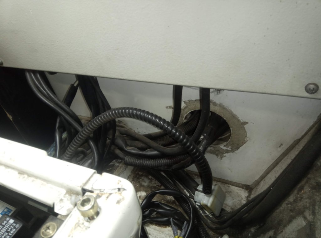 Da ich ja keine Unterdruckschläuche mehr hab, hab ich den Durchlass benutzt, um das Kabel durch zu führen: Das eine Kabel zum Innenraum war das schlimmste, zum einen da der Durchlass zum Innenraum eh schon total zugestopft mit Kabeln ist (mit Zusatzkabeln vom Aufbauhersteller), zum anderen ist alles nicht mehr so elastisch wie es bestimmt vor 20 Jahren mal war...