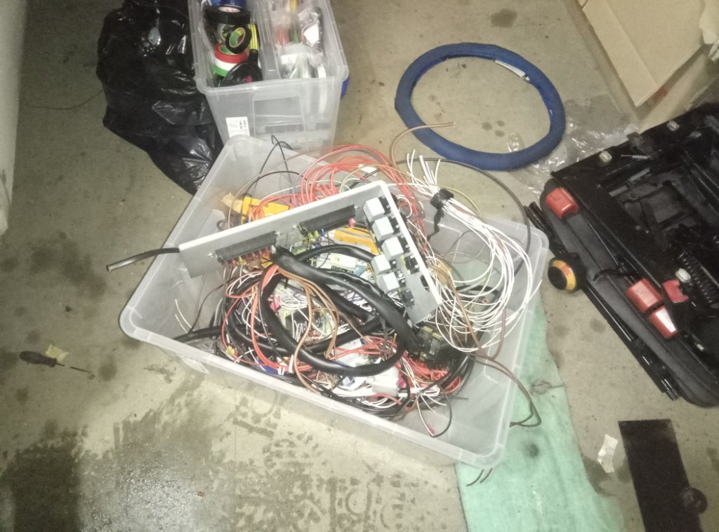 Kabelsalat hat sich wohl auf den Mercedes-Kabelbaum reduziert: Und eine ganze Kiste voller Kabel ist dabei angefallen: Und das sind nur die ganzen Kabel, die in der Sitzkonsole waren sowie im Schaltkasten hinter dem Fahrersitz. Alle Kabel die hinten im Aufbau liegen sowie alles was vorne irgendwo in den Motorraum geht ist noch im Auto, da kommt noch einiges zusammen!