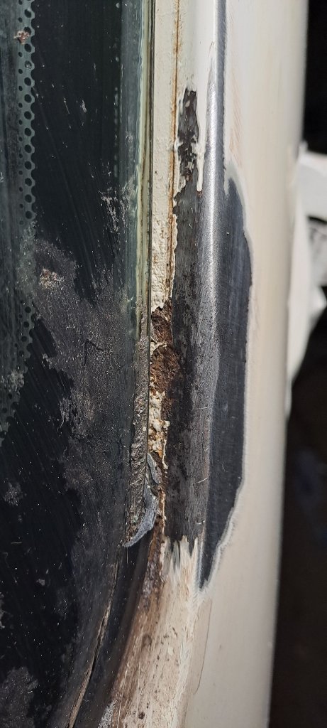 Außerdem ist der Rost schon scheinbar bis unter den eigentlichen Scheibenkleber gewandert. Wäre also wohl nur eine Frage der Zeit, bis da Wasser eintritt.