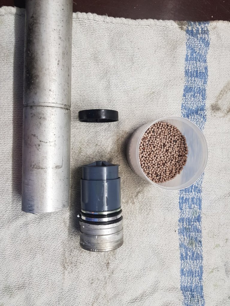 Diesen zweiten Einsatz habe ich auch ausgebaut. Dieser besitzt innen eine große Druckfeder, welche mit diesem gröberen Sieb die Silikatkugeln hinter dem 2. Einsatz zusammendrückt.
