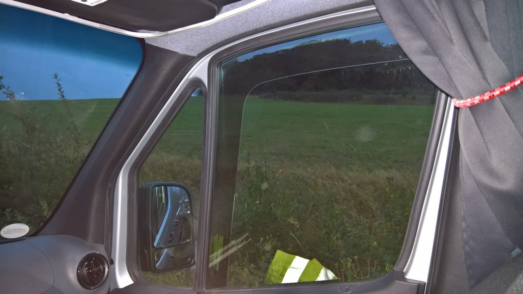 Und für den heutigen Abschluss noch meinen Vorhang im Cockpit. Ich wollte sowas haben wie Vattern im LKW, das ist bei der unförmigen Verkleidung aber der Wahnsinn. Ich habe mir damals für den alten Sprinter in irgendeinem Haushaltswarengeschäft (Tedox, Hammer oder sowas) ein Schienensystem ausgesucht welches noch einigermaßen weich ist. Dazu gibts fertige 90° Bögen wo die Rollen zwar leider nicht perfekt sauber durchlaufen und gerne mal leicht haken, aber das ist noch ok. Wenn man einmal die Technik raus hat ist der Vorhang ruck zuck zu oder wieder offen. Die Schienen selbst habe ich damals unterwegs auf einer großen Holzkabeltrommel mit viel Fluchen und viel Gefühl zurechtgebogen. Gott sei Dank passte das mit einer leichten Nachbiegung vorne in der Mitte beim neuen Sprinter auch noch. Nunja, hier dann einmal offen und einmal zu. Ich komme wie man sieht auch noch überall ran. Diese fertigen Vorhänge die dann vor dem Armaturenbrett hängen mag ich nicht. Vorhänge sind übrigens auch aus dem gleichen Heimtexgeschäft und waren super billig. Abgeschnitten und umgenäht hat sie meine Mutter. Das sind Thermovorhänge, was sich insbesondere an dem großen Vorhang zwischen Cockpit und Ladefläche bemerkbar macht. Manchmal stehe ich morgens auf, hinten sinds noch gemütliche 21°, steckst du den Kopf durch den Vorhang fällst du fast um, weil vorne etwa 10° mehr sind. Der Vorhang in der Windschutzscheibe ist also mehr Sichtschutz, der macht Wärmetechnisch nicht ganz so viel aus. Der Vorhang zwischen Vorne und Hinten teilt dann aber echt die Klimazonen.