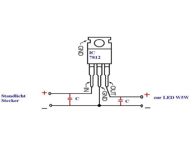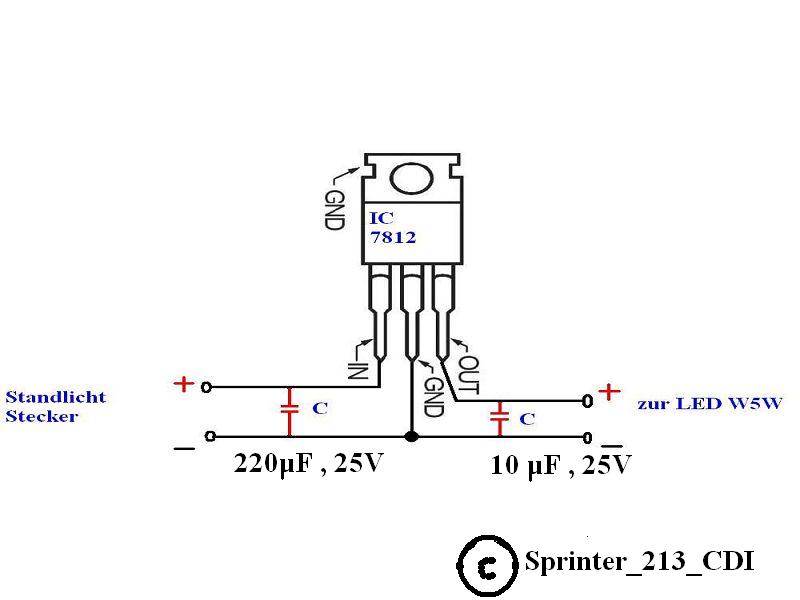 Nun drei Dioden ( 0,7V ) in Reihe, vor dem Standlicht, würde auch gehen. Aber wie bereits geschrieben, die Lösung mit dem IC 7812 hat sich in anderen Foren bewährt. Hab aber leider keine Schaltung gefunden.
