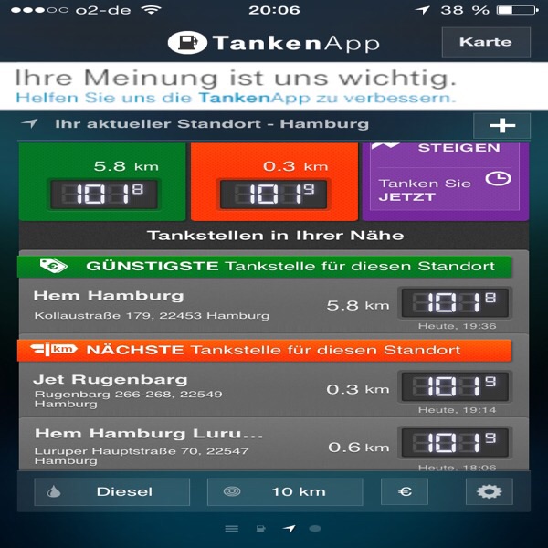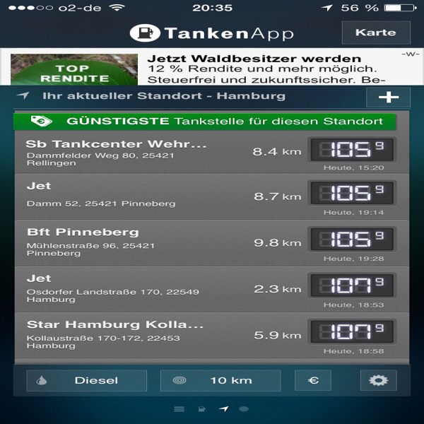 Gratis-App kann ich nur empfehlen, sucht automatisch auch unterwegs im eingestellten Umkreis, Preise werden ständig von den Tankstellenpächtern und Kunden aktualisiert, gibt es glaube ich auch für die Androit-Handys !