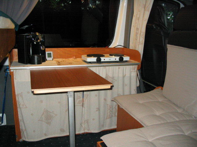 Heute habe ich für den TÜV noch ein bisschen nachgebessert . Kochplatte befestigt und einen Klapptisch mit seitlicher Verstellung gebastelt.