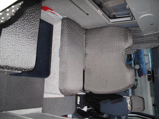 Ich kann nur die Sitzbank hinter dem Fahrersitz umklappen, welche dann von unten mit einem ausziehbaren Stahlrohrrahmen gehalten wird und somit eine Liegefläche zur gegenüberliegenden Sitzbank bringt. Der ausziehbare Vierkant-Stahlrohrrahmen befindet sich auch auf der gegenüberliegenden Seite an der Sitzbank, wo bei mir der Frischwassertank drunter verbaut ist.
