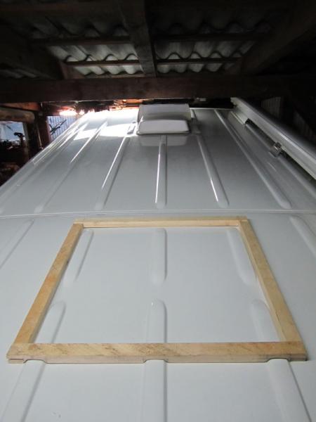 Der Anfang ist gemacht. Eine zweite Dachluke 50X50 soll in den Hinteren Dachbereich eingebaut werden. Dafür habe ich erst mal einen Holzrahmen als Schablone angefertigt der die Sicken überbrückt. Der Rahmen soll dann aus Alumaterial (Seewasserbeständig) 30X20 gefertigt werden . Ich habe heute mal durch die Deckenbeleuchtung den Abstand zwischen den beiden Dachrahmen gemessen. Es sollten Stramme 500mm dazwischen sein