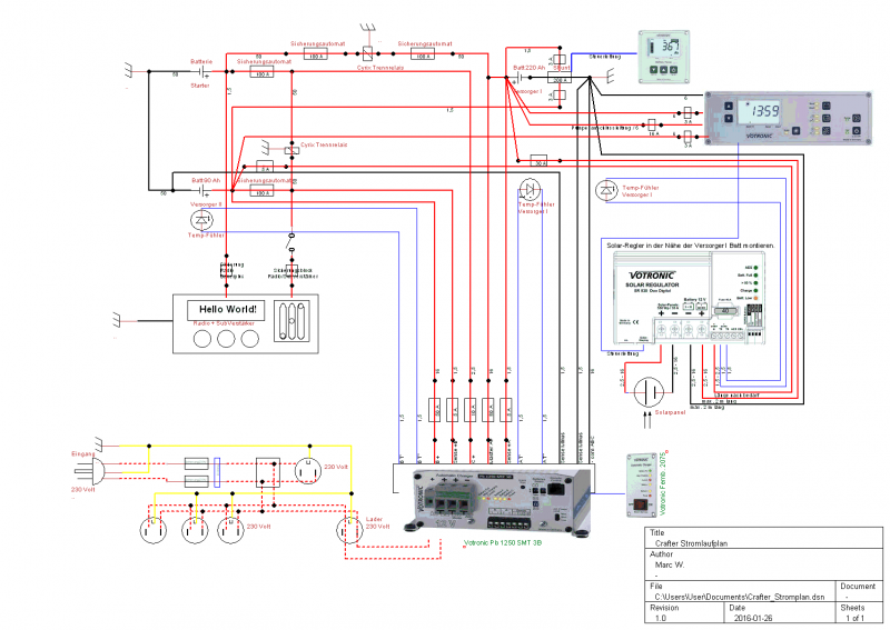 Wie ihr auf dem Schaltplan seht, soll einmal der Strom über die Außensteckdose kommen und während der Fahrt über die Lichtmaschine.