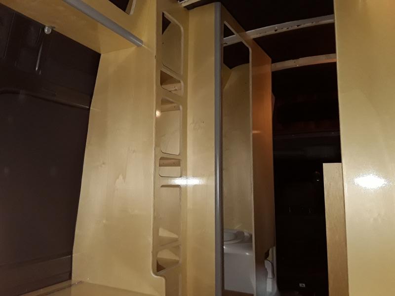 Die Schränke sind an Board. Es fehlen noch die Klappen, versprechen jedoch sehr viel Stauraum. Zwischen den Schrankfächern die Aufstiegshilfen für das Hängebett unter dem Dach für unsere Tochter. Hoffe das klappt