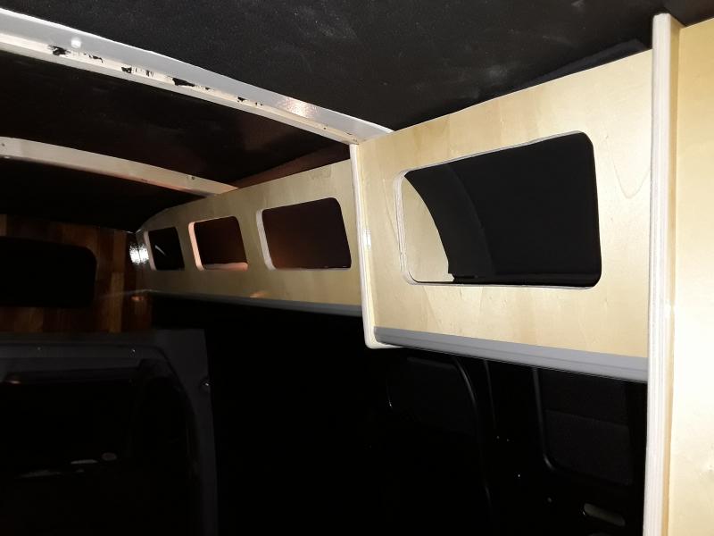 Schränke oben vervollständigt und die Seitenverkleidungen an der Rundsitzbank hinten.