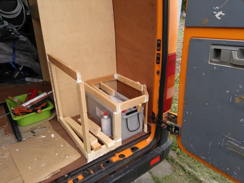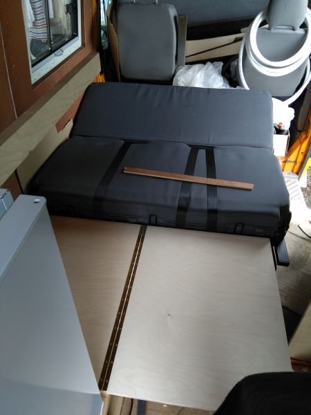 Auch die Batteriehalterung ist geschweisst (hatte ich geplant diese Mittag fertig zu machen) und ich habe ein Schlauch zum schutz von die später zu ziehen Pluskabeln gezieht von die Starterbatterie bis zum Batteriekasten im Heck. Matratzen für unseres Bett sind auch fast fertig und meine Frau arbeitet jetzt an die für die Kinderbetten.