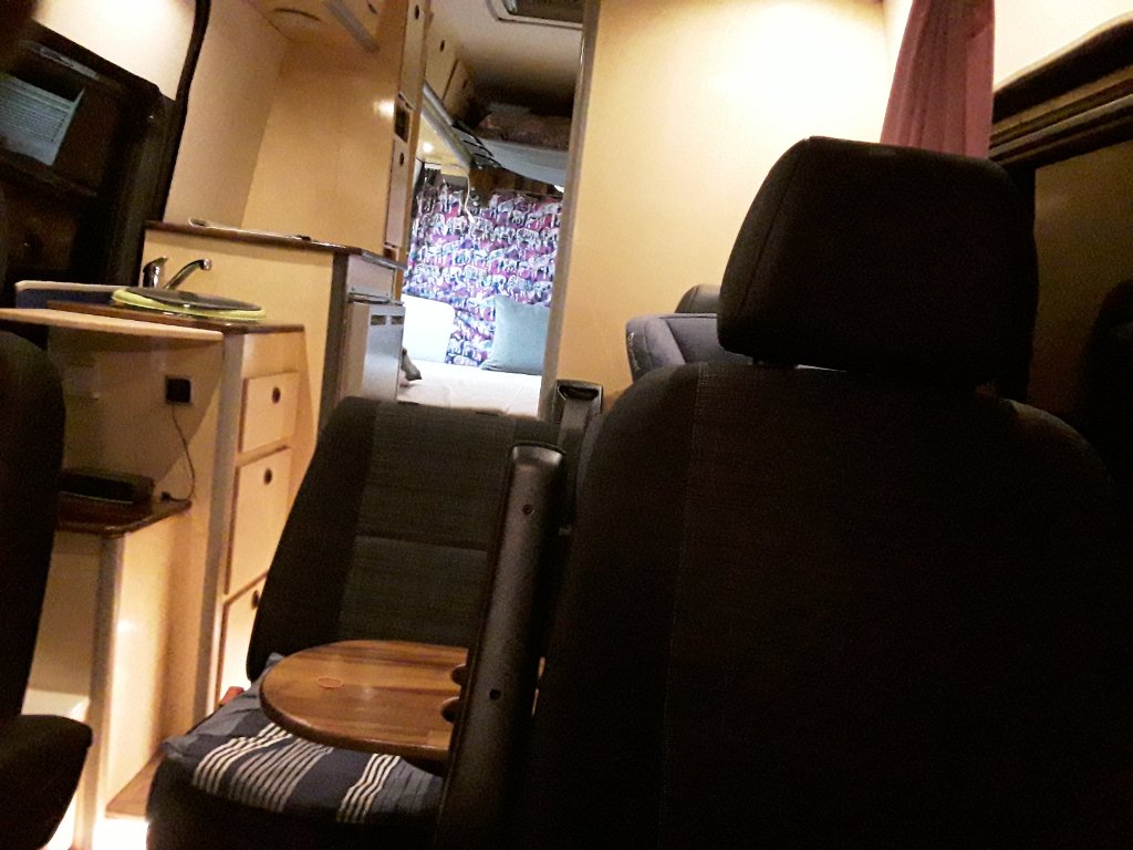 3 Personen, Surf- oder Skizeug drin. Vorne =Sitzgruppe, hinten Sitzgruppe bzw. 3 Betten. Klo, Küche aber keine großen Wassertanks. 3o l Küche, 15 l Bad und 15 l Klo. Keine Dusche mit Gedöns aber Fußboden aus 14 mm Eichendielen = Echtholz. ( Brauche doppelten Boden wg Surf/Ski.)