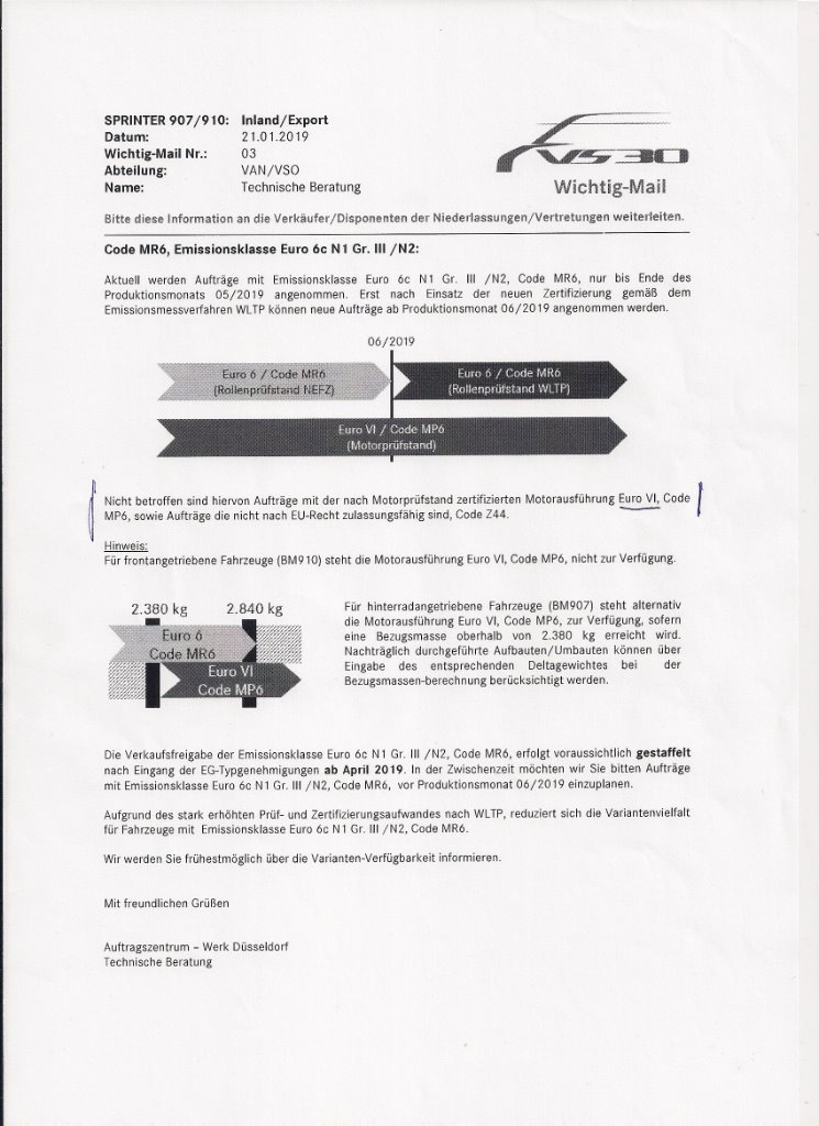 ich habe in dieser Woche erfahren, dass der Sprinter ab sofort als Euro 6D bestellt werden kann. Baubeginn im Werk Mai 2019, Auslieferung ab August 2019.