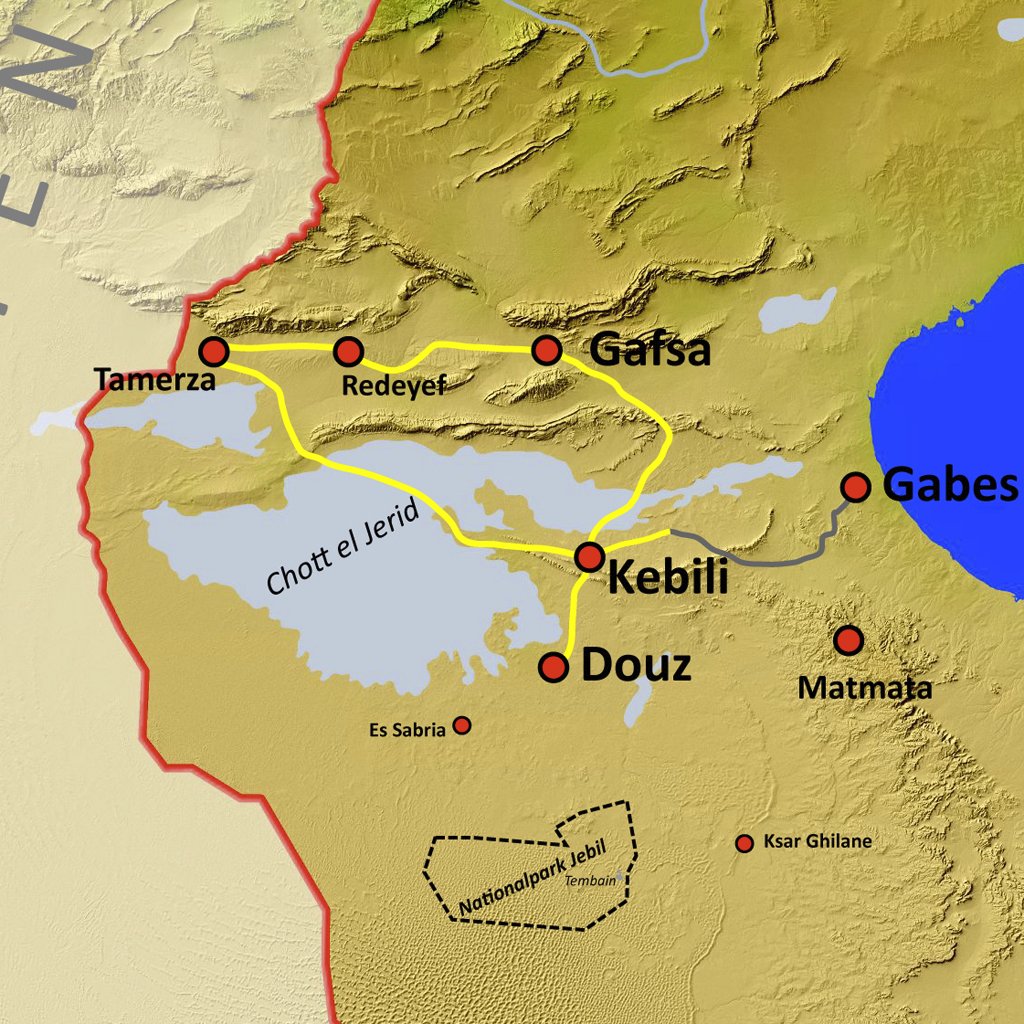 Mit ca. 7000 qkm ist der Chott el Jerid der größte Salzsee der Sahara. In Ost-West-Richtung führt eine gut ausgebaute Teerstraße durch den Chott. Was passieren kann, wenn man nicht die Straße nimmt, sieht man ungefähr in der Mitte zwischen den beiden Ufern: dort steht in einiger Entfernung das Blechgerüst von einem Reisebus. Er hat wohl vor Jahren einmal versucht, über den ausgetrockneten Salzsee zu fahren und ist dort so versunken, dass er nicht mehr gerettet werden konnte.