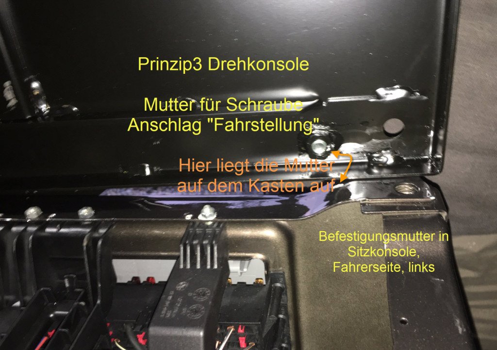 die Schraube für den Dreh-Anschlag der Konsole habe ich auch entfernt. weil sonst das Kunststoff der Sitzverkleidung da hängen bleibt.